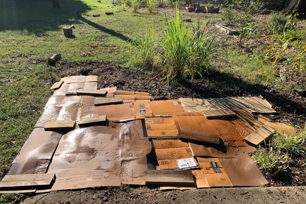 With the plantings complete, I prepared the lower portion of the meadow for winter. I placed the cardboard as before, and added extra weights to keep it in place.