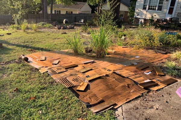 For the rest of the summer, I watered the cardboard every day there was no rain. On hotter days some pieces dried out, wrinkled, and uncovered the soil below. I shifted the weights, added water, and ignored the jokes from inside the house.