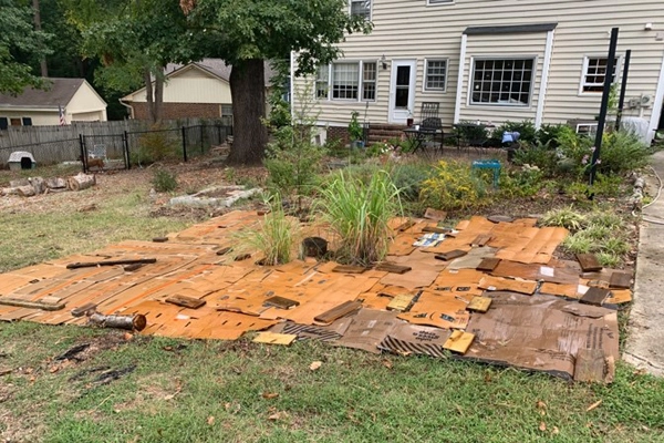 The final piece to plan was the lawn—and how to kill it. Regardless of the method, the lawn must be completely removed to keep crabgrass runners out and competition down. I eliminated using chemical herbicides, prioritizing the non-turf organic life in the soil; maintaining these beneficial organisms will help the new plants establish. Alternative methods included mechanical stripping, baking it with plastic, and smothering it with cardboard. The final approach seemed most reasonable, using wetness and darkness to make the soil inhospitable to plants.