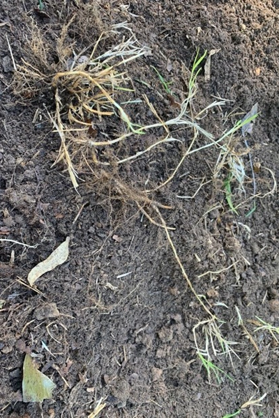 I used a hand cultivator to dig into the soil, isolate the plant centers, and remove them. In the fluffy, loose soil behind I planted the plugs. The Carex and Chasmanthium roots easily pulled apart for planting, but the Andropogon roots were thicker and more tightly bound. For those I used the cultivator to tease them apart as best I could. I worked my way down the slope, removing cardboard, digging out weeds, and installing plugs. I arranged the plants in drifts or clusters, grouping 7-12 plugs together to create small communities that would knit together as the meadow matures.