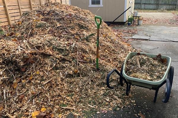 A few weeks later, we received our drop of wood chips from the local arborist - a perfect mulch, full of organic matter and complex textures that retain moisture without matting. I covered the cardboard with 3-4 inches of the chips, which would help keep the cardboard wet and in place all winter. I sprinkled an inch of the chips onto the new meadow grasses, and raked our leaves into the bed to provide additional organic matter that would break down more quickly.
