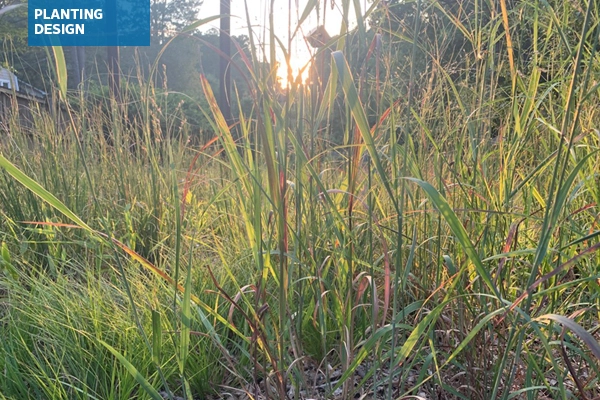 The summer heat carried on into September. The grasses continued to spread out and lean over each other. Emerging from their centers were beautiful seed heads. First to emerge were branching sprays of Switchgrass, followed by erect stalks of Andropogon. Their foliage began to display colorful highlights of maroon and deep red. These colors intensified through the fall and looked stunning in the early morning sunlight.
