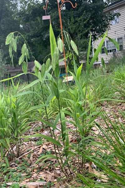 Chasmanthium, also known as Northern Sea Oats, displayed flat, layered flowers on arching branches in July. The oat-like heads transitioned to a toasty brown color dangling from those branches.