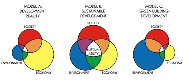 This report is a philosophy on sustainable development; the Sustainability Score takes this philosophy to an applicable use. The figure below provides some visual concepts on sustainability from the International Union for Conservation of Nature (IUCN) report The Future of Sustainability: Re-thinking Environment and Development in the 21st Century. Model A represents the reality of “non-sustainable” development today by weighing economic and monetary concerns the most. Model C represents green building projects that weigh environment the most. The idealized model, Model B, represents the balance required to achieve sustainable development as identical, equally weighted circles.