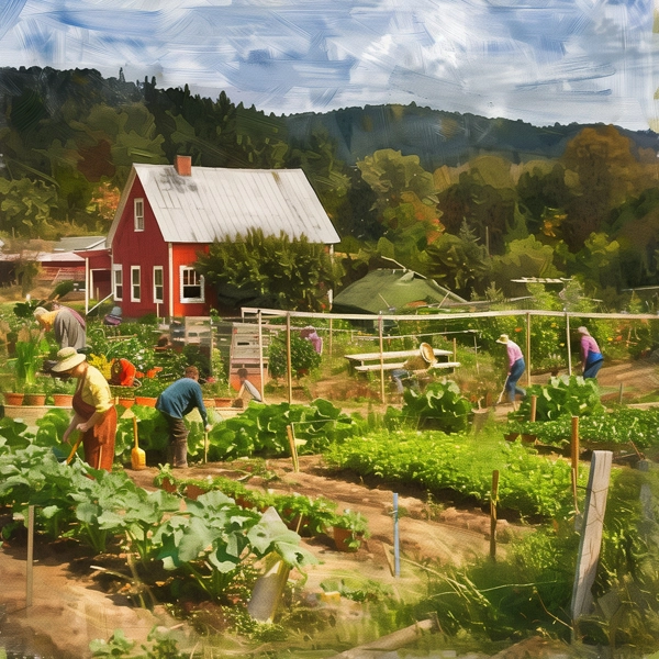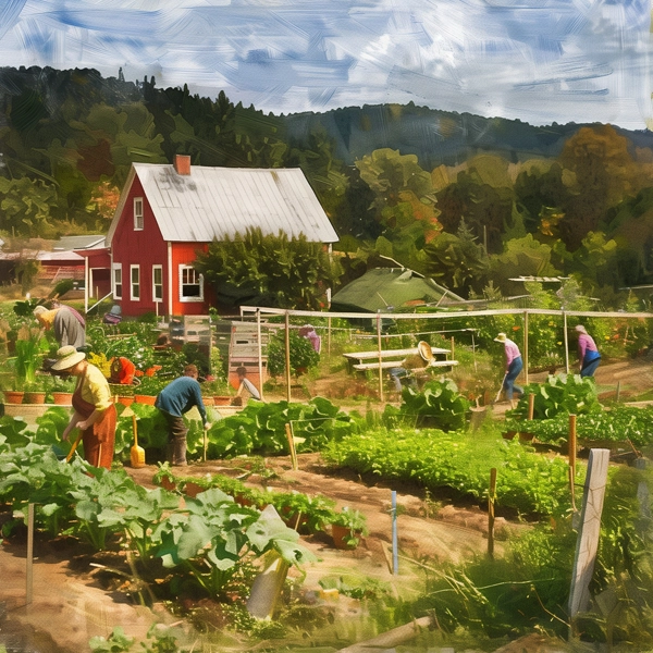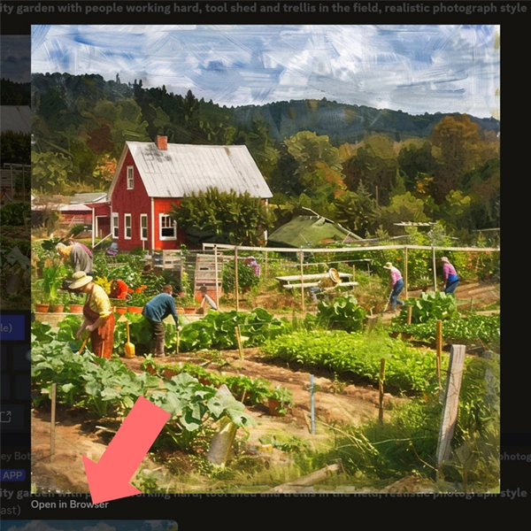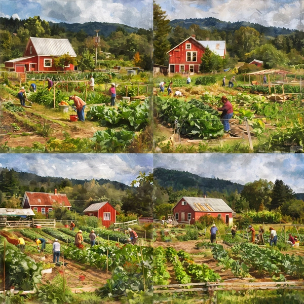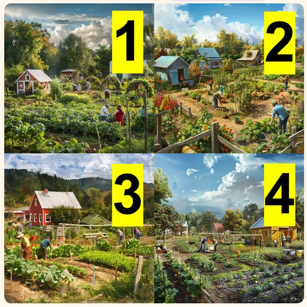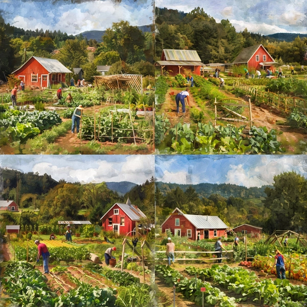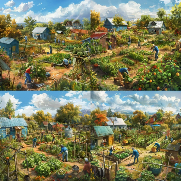 /imagine prompt Colorful community garden with people working hard, tool shed and trellis in the field, realistic photograph style