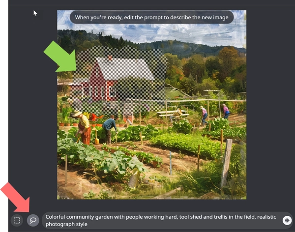Vary (Region): This option allows you to make changes to a specific area. For example, if you want to modify only the red barn area. You can use the “Lasso tool” (See Figure 10, red arrow) to draw around the red barn (green arrow). The selected area will be covered with a checkerboard pattern.