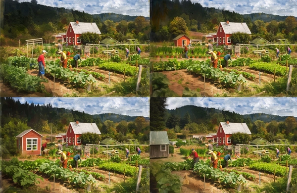 Vary (Strong): This option will generate a grid of four new images with much more significant modifications. In Figure 9, you can see that the barn's design, location, and quantity have changed more dramatically than previous example.