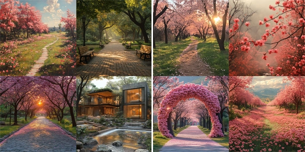 In the example below (Figure 3), a simple prompt is used: urban park filled with blooming trees. By modifying the weight of the words, the results are altered to emphasize either the urban park, or the blooming trees.