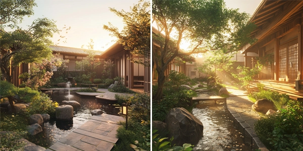 Prompt Used: Sustainable rooftop garden with a tranquil atmosphere, lush greenery, traditional Japanese elements, flowing water features, soft wind-blown leaves, serene stone pathways, natural wood structures, peaceful ambiance, Ghost of Tsushima art style, wide-angle shot, soft golden light, cinematic render.