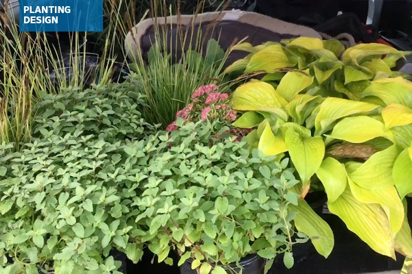 Picking up the haul of nursery-bred cultivars and non-natives to be mixed in with the existing native plants of the prairie in the experimental landscape plot. Plants seen in the photo (from left to right) include Sesleria autumnalis, Nepeta racemosa ‘Blue Wonder,’ Hylotelephium spectabile ‘Autumn Joy’, and Hosta ‘August Moon.’ / image: John Kamp