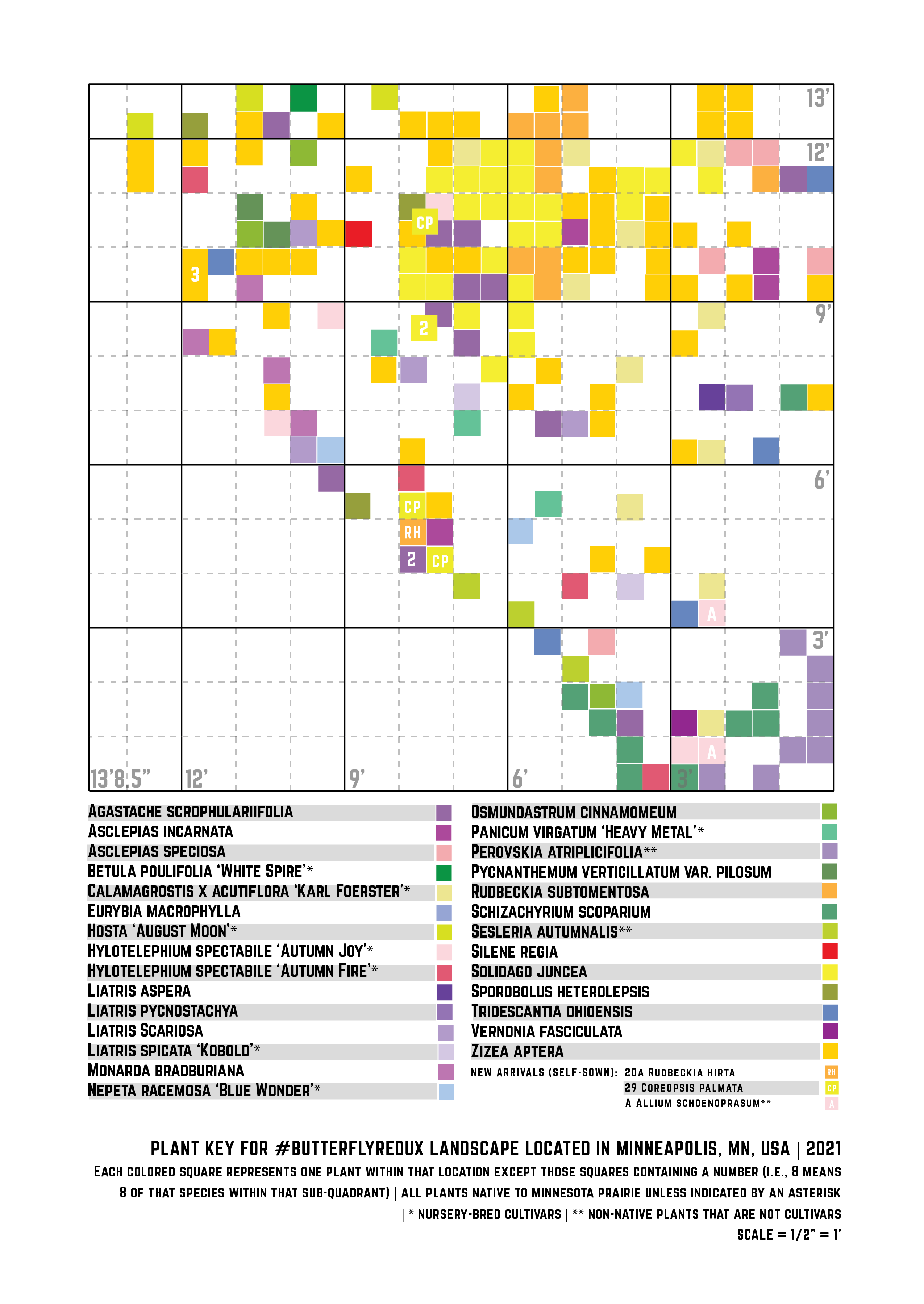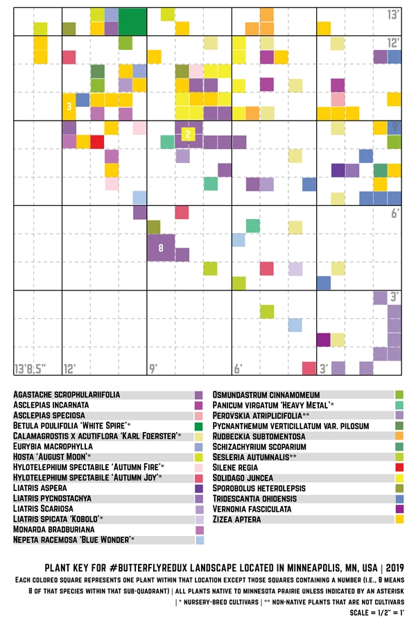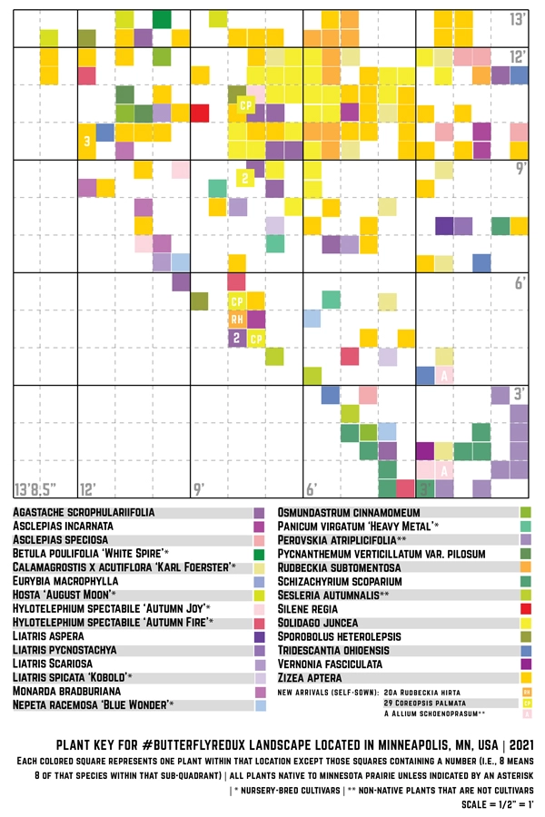 The color-coded grid from 2021 showing the location and quantity of plants by species. Between 2019 and 2021, three new species had “arrived” to the landscape on their own. These arrivals are reflected in this newer grid. Click here to view at a larger scale. / image: John Kamp