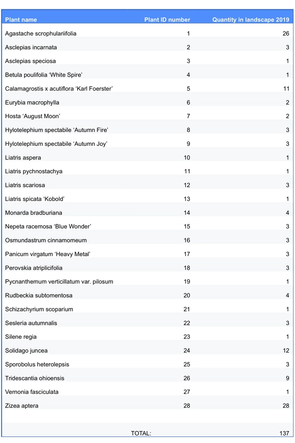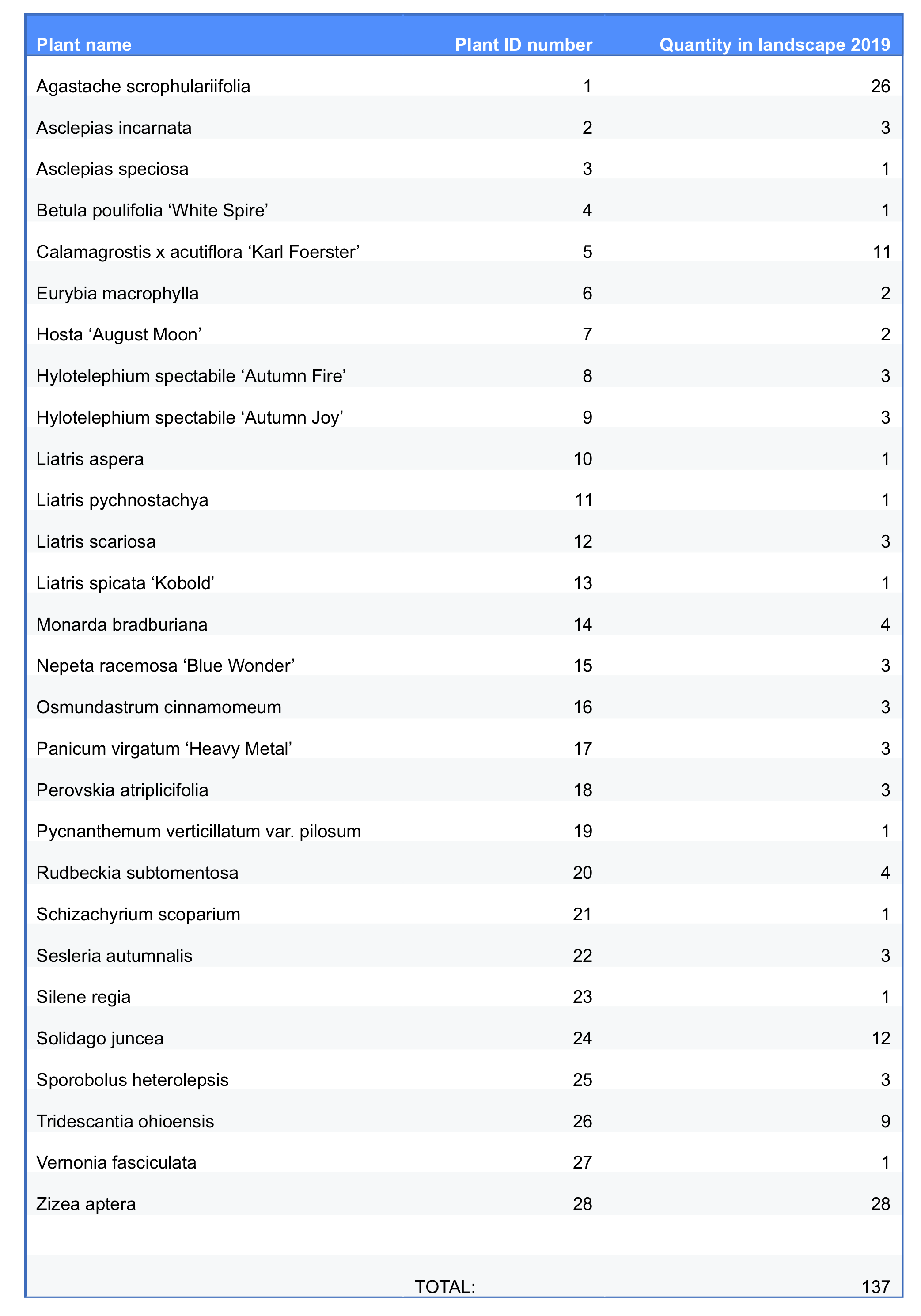 With the exception of the ‘Karl Foerster’, of which we had planted 11, the quantities of the other plants remained at four or below. By the end of the first-year survey, we had counted 137 total plants in the landscape.