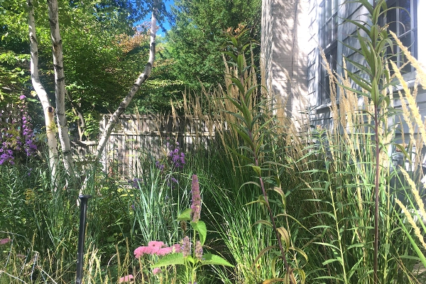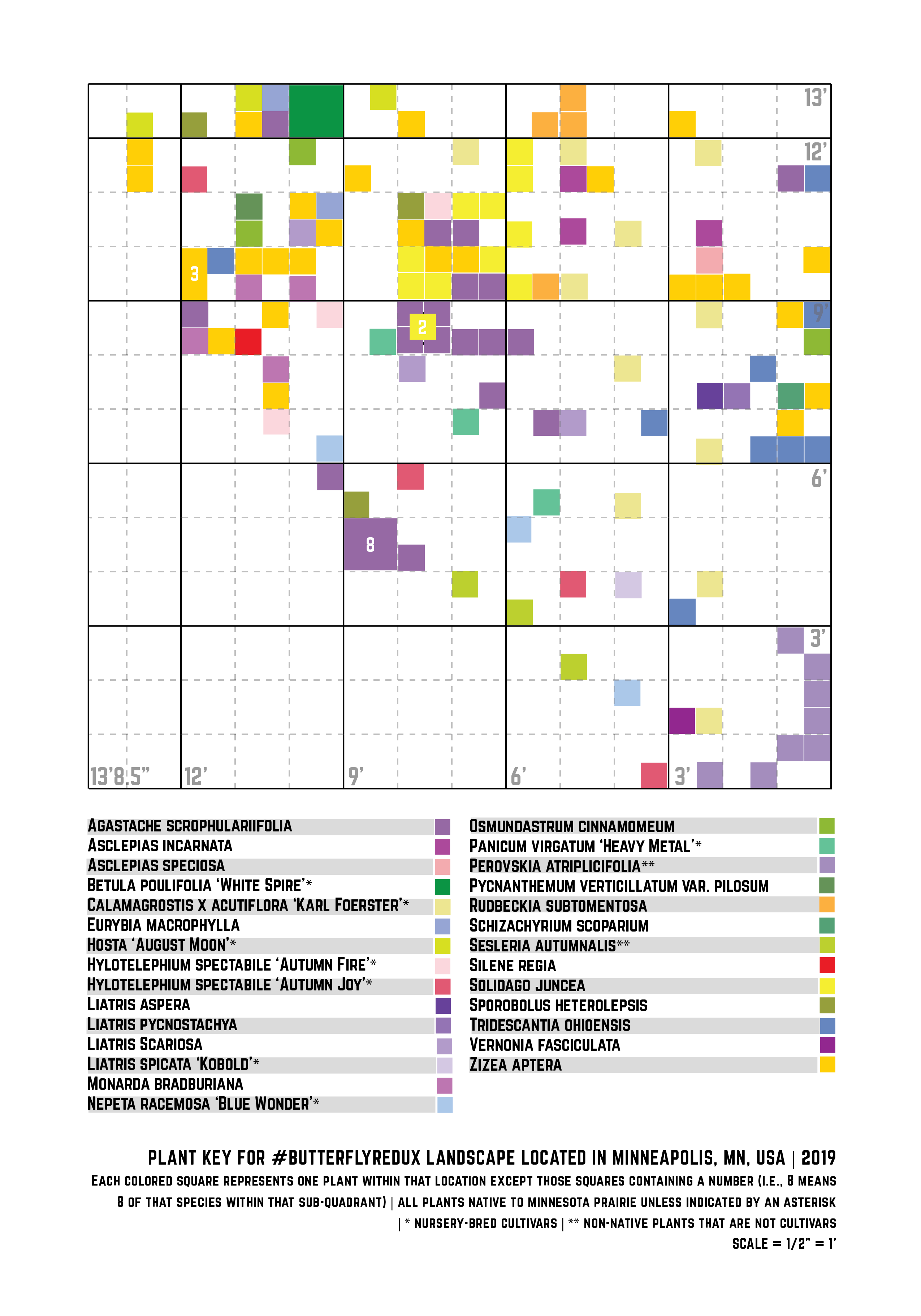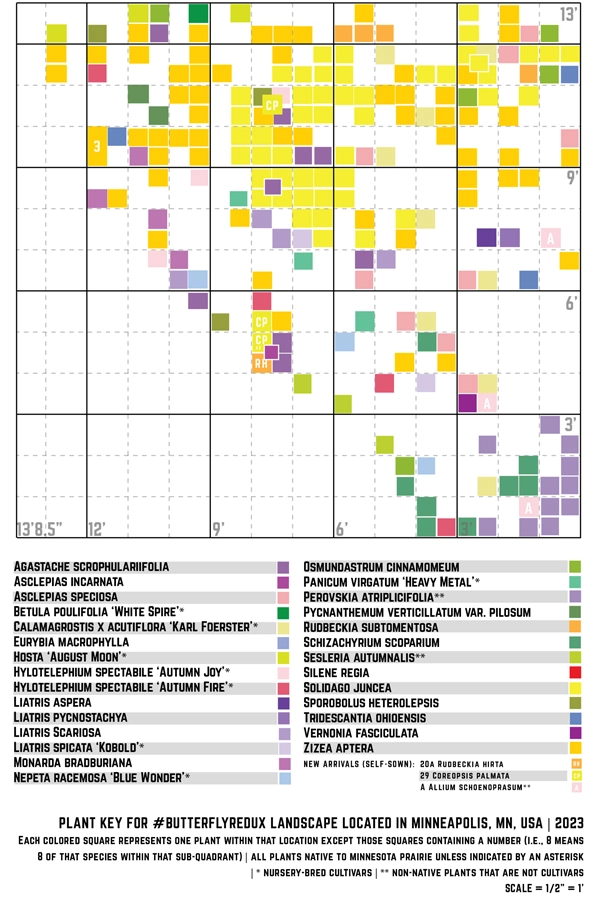 The rest of the existing plants I left where we had planted them two years prior when we initially planted the garden, or where they had self-sown after the initial planting. These existing plant species included all of those in the original nursery-curated butterfly kit, and some plants that pre-dated the butterfly garden itself but were not removed when we planted it in 2017—including Betula populifolia ‘Whitespire’, Perovskia atriplicifolia, Liatris spicata ‘Kobold’, and Osmandrum cinnamomeum. Ultimately, the number of combined native/non-native species within the space totaled 28.