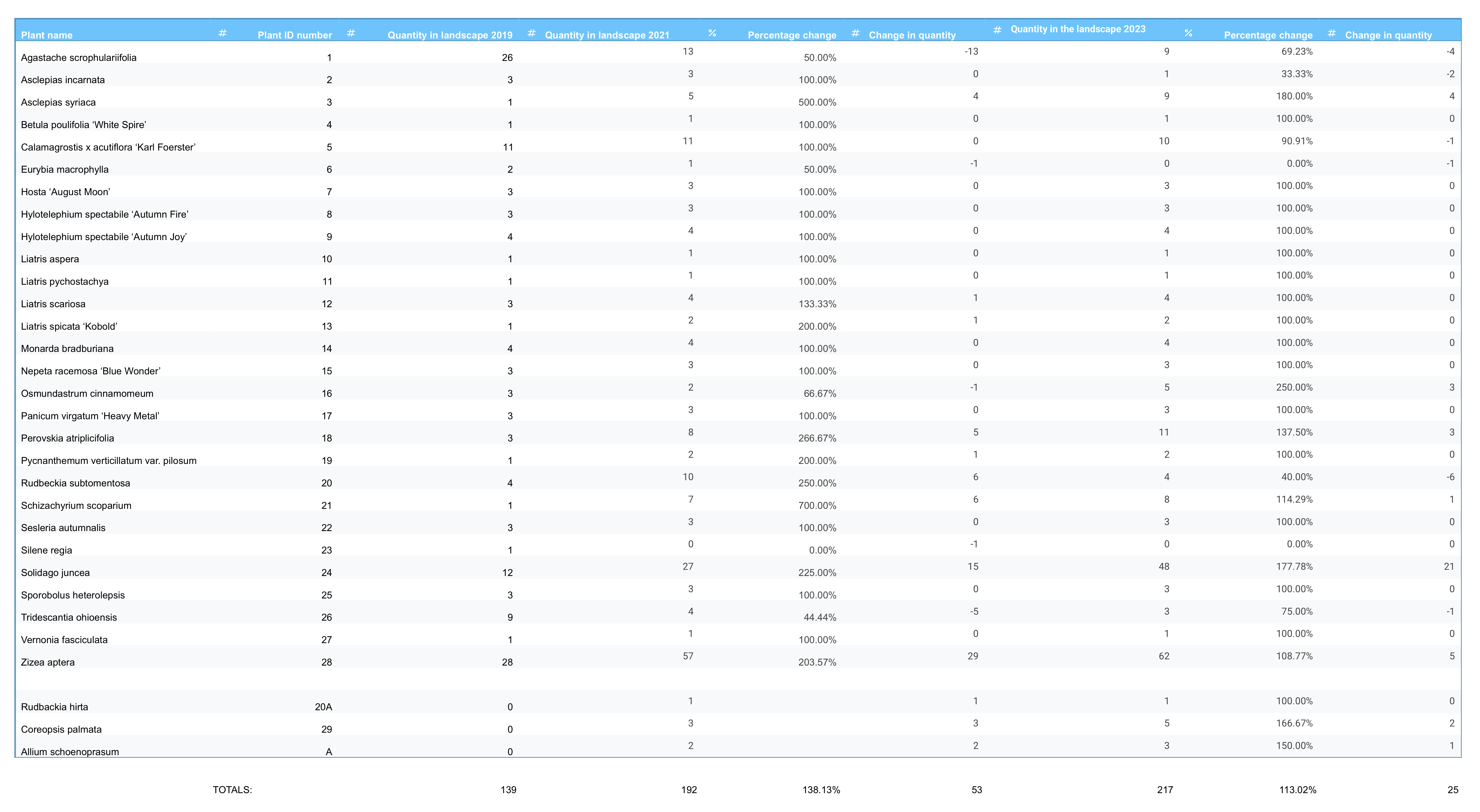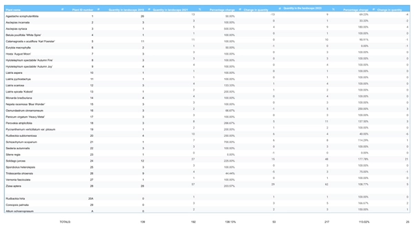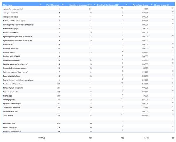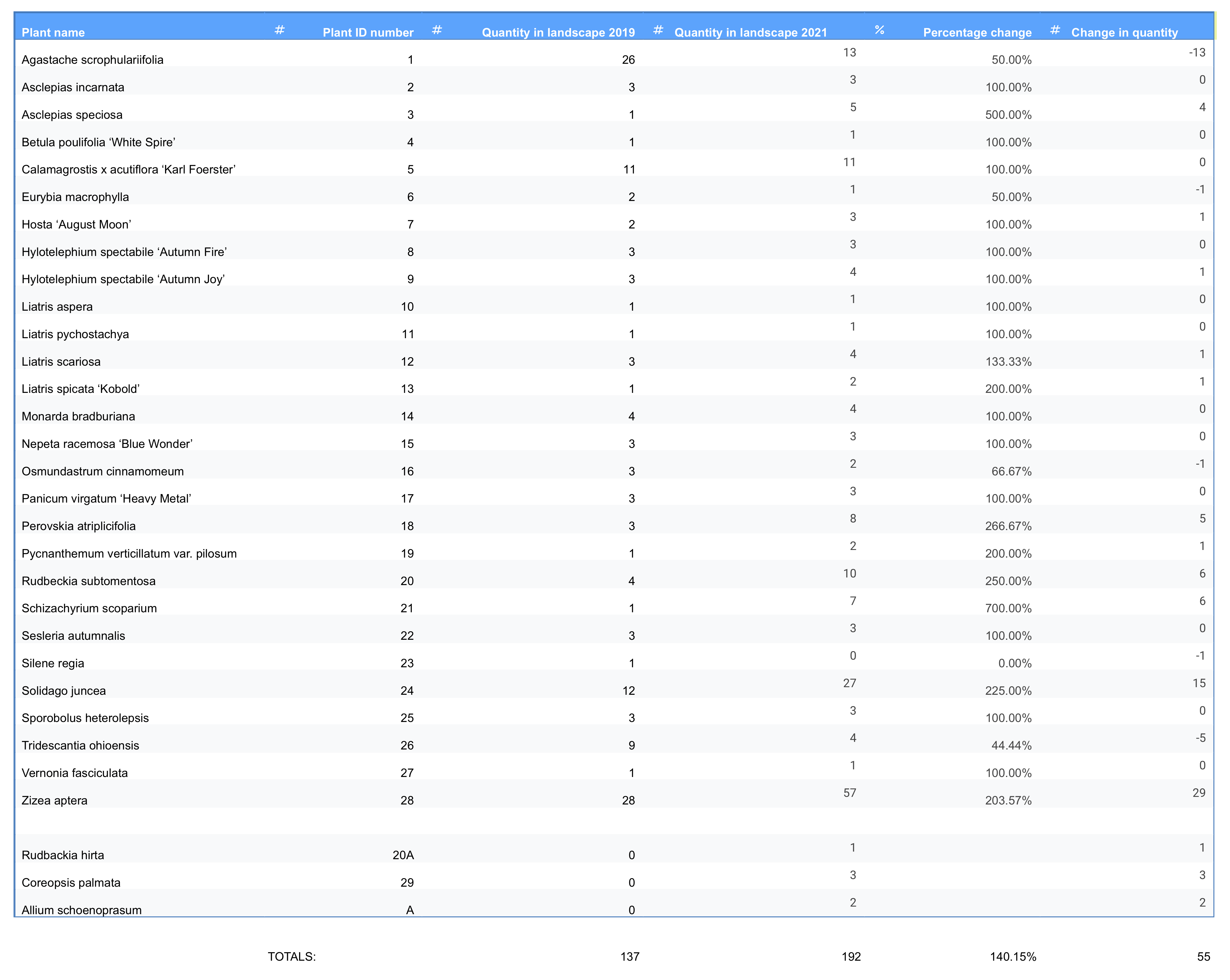 The landscape in numbers in late summer of 2021, with 192 plants in total growing within the space (a 140% increase from 2019). Click here to view at a larger scale. / image: John Kamp