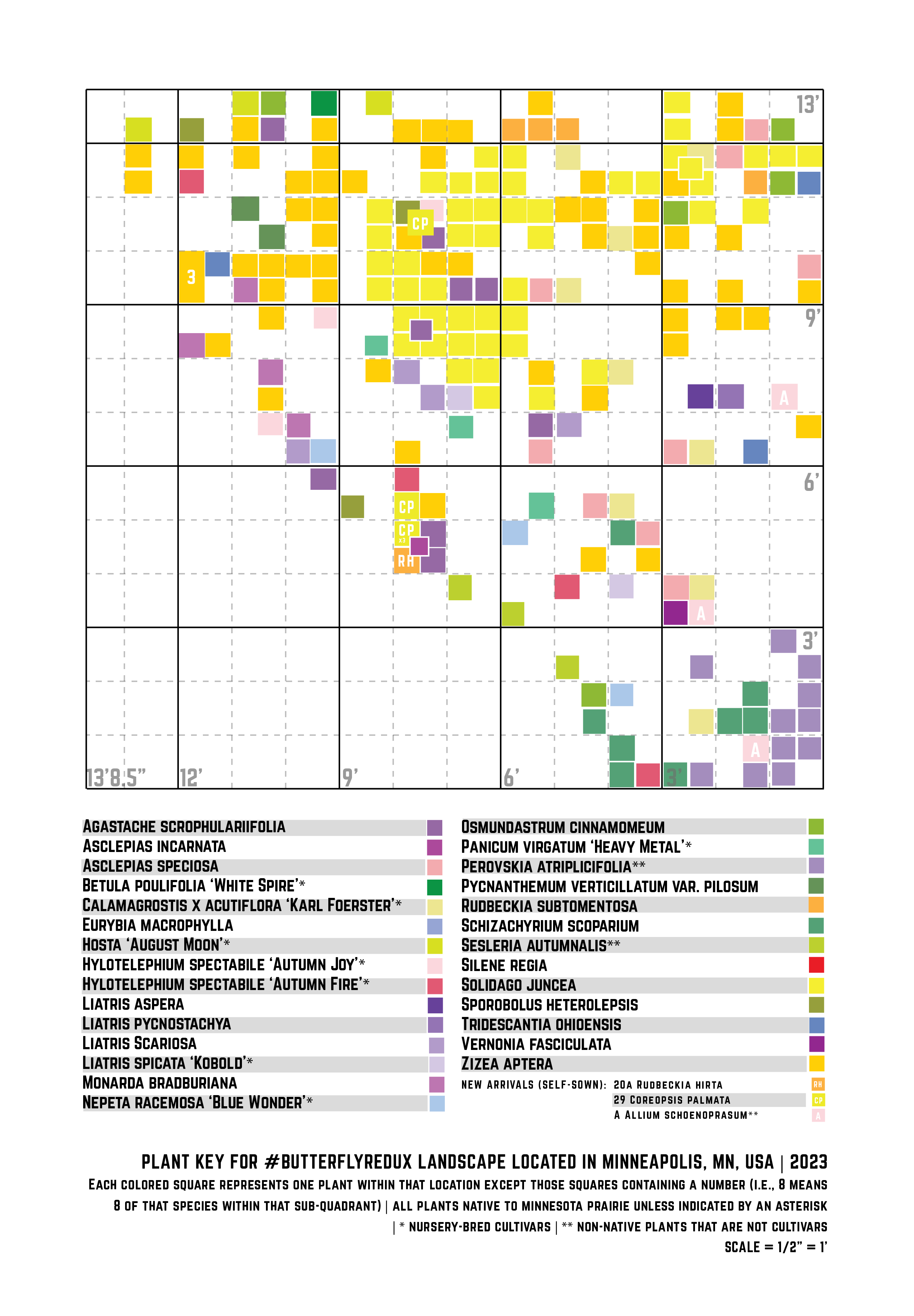 The color-coded grid from 2023 showing the location and quantity of plants by species. Click here to view at a larger scale. / image: John Kamp