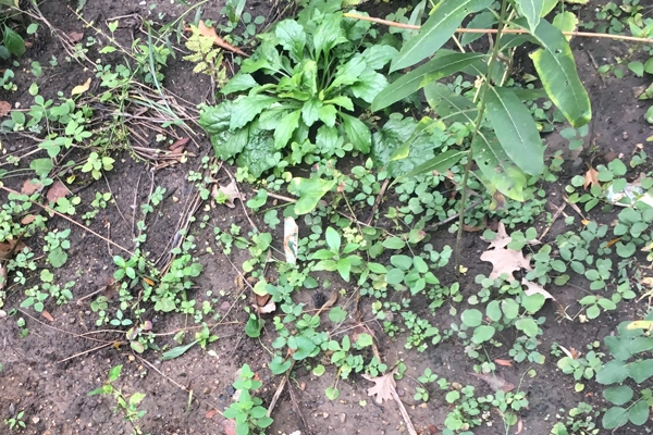 Plants emerging in the experimental landscape in spring. To the untrained eye, all of these might seem to be weeds, thus presenting challenges if a contracted crew is going to be taking care of the landscape long-term. / image: John Kamp