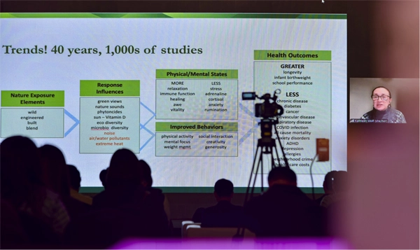 Ms. Zhang opened the forum to encourage the landscape community in Shanghai to maintain a commitment to designing for wellbeing in landscape and highlighted the Shanghai Landscape Forum's mission. She reflected on recent media interest in the lawn seating terraces created as part of Sasaki’s Runway Park in Shanghai to highlight how landscapes can be important vehicles for natural and social healing. Ms. Zhang then reflected on a survey of health conditions of urban dwellers which highlighted the increase in depression in China, second only to cardiovascular disease, hence the importance of the forum topic to explore wellness through our professional work.