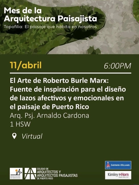 Also during World Landscape Architecture Month, I was invited to present to the Institute of Landscape Architects of Puerto Rico (of which am also a member). For this presentation, I also highlighted the work of Roberto Burle Marx, but this time from the humanistic geography point of view originated by Yi-Fu Tuan (1974) in which the special love for peculiar places, or topophilia, is present in Burle Marx’s work, and how the emotional aspect is present in most of his work beyond the constructive aspects.