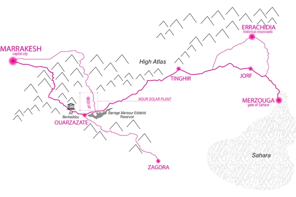It’s easy to overlook, given the barren arid landscape, that the area around the Nour Plant is actually rich in culture and history. This location is at a cultural crossroads along the scenic Marrakesh-Merzouga route, a gateway to the Sahara. Just 10 minutes east of Nour, there’s a chain of oasis villages, some now abandoned, that rely on seasonal springs from the mountains. This traditional setting is in stark contrast to the high-tech solar plant nearby.