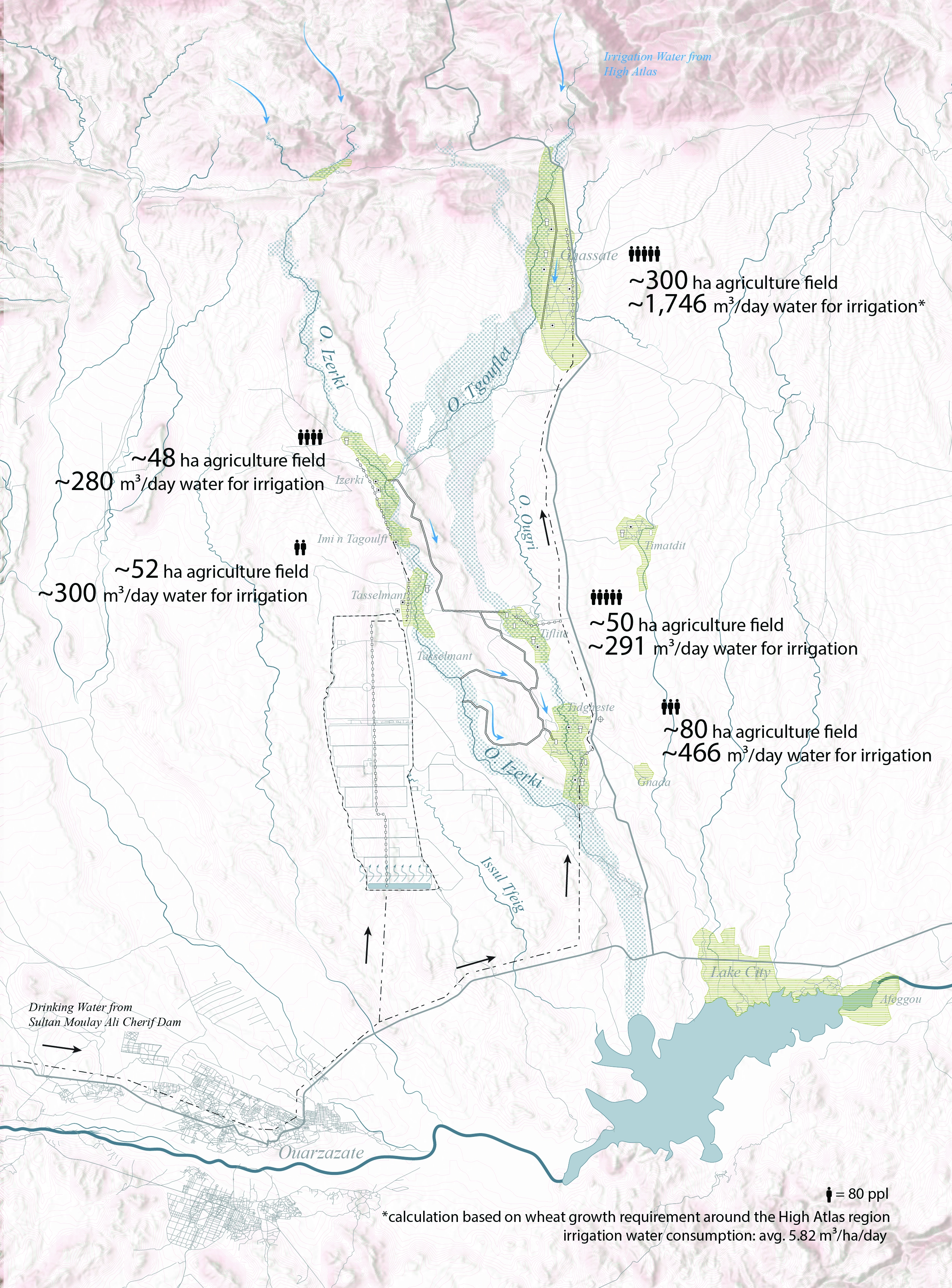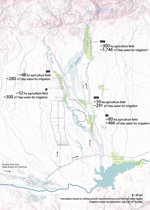 These villages, however, face increasing challenges. With jobs scarce and droughts worsening, traditional farming and nomadic lifestyles are declining. Water distribution is highly imbalanced, with upstream almond farms consuming more resources while downstream communities struggle with dry channels and dwindling groundwater. Meanwhile, Nour itself requires up to three million cubic meters of water annually for cooling and panel cleaning—equivalent to the yearly consumption of 5,000 households (see diagram below).