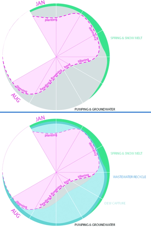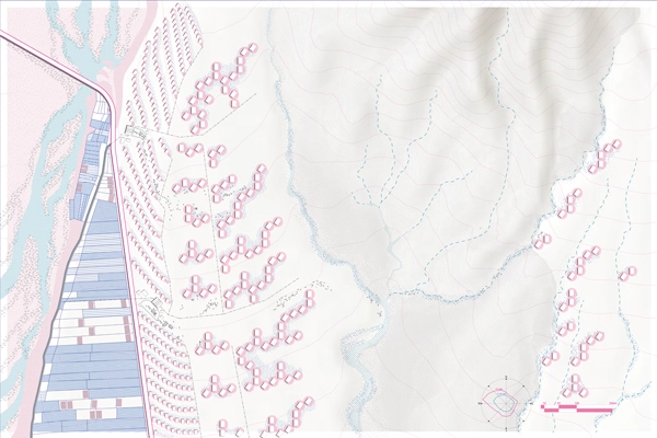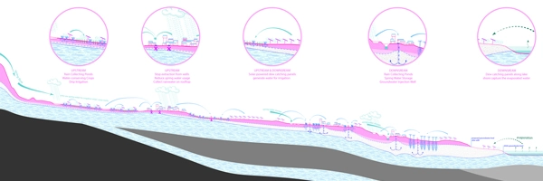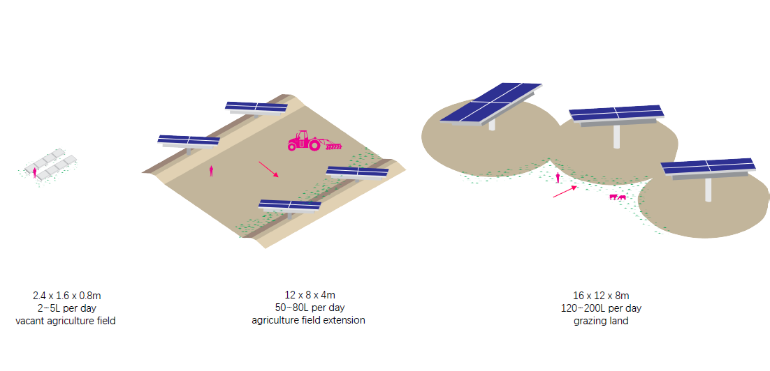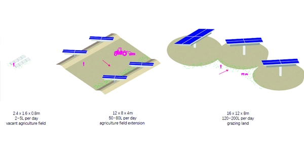 3 – Site Scale: In underutilized fields, active dew catching panels, also known as “hydropanels,” will be installed to harness solar energy to extract water from air for irrigation during dry seasons. The ‘pore’ space between these hydropanels will support future agricultural and pastoral development.