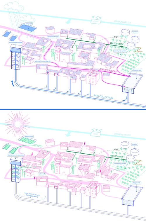 2 – Village Scale: The design integrates rainwater collection systems and wastewater management into public spaces. Key components such as rooftop collectors, drainage channels, infiltration beds, and storage tanks will be strategically placed to maximize efficiency. (See diagram below.)