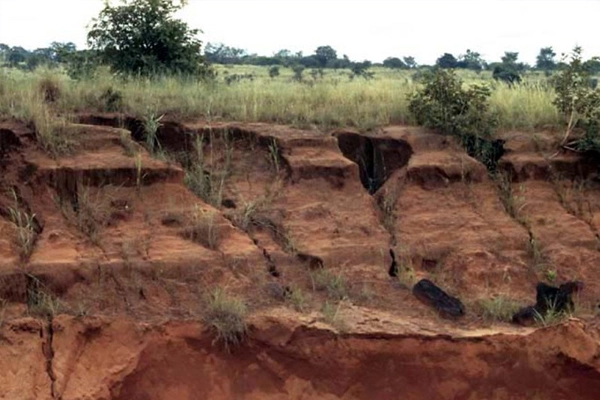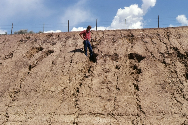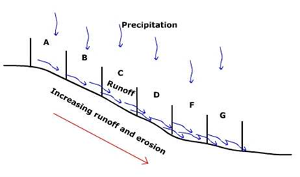 Slope steepness and length are not the only important factors to consider in preventing erosion and encouraging revegetation along slopes. The impact of raindrops alone on bare dirt can dislodge soil at the top of the slope, carving a path for concentrated flows and erosion even on shorter slopes. In fact, “the energy of [raindrop] impact would be found to be much higher than the energy of flowing water” (Indian Roads Congress) so slope length is arguably less important than the ability of a slope to revegetate before an intense storm event. Vegetation protects the soil surface from the impact of raindrops and breaks up the energy of stormwater flowing downhill. Root systems stabilize slopes by holding soil particles together and creating soil pore spaces that allow for water infiltration. The more water that infiltrates, the less will flow across the landscape as runoff. The photo below helps illustrate the susceptibility of bare soil to erosion, and a time-lapse video shows this dynamic process even better.