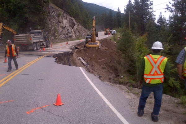 Even if a drainage design is sound, because runoff and slope stability calculations often assume successful revegetation, slope failure might result if precipitation is atypical. Slope failure creates a safety hazard as debris can fall into the roadway and injure travelers or damage the pavement (see image below). A 2011 article about recommended practices for reducing erosion risk along slopes noted that “Most…surficial landslides occur as a result of loss of vegetation cover on soil slopes due to a cut being made for road construction…as a result of erosion due to flowing water.”