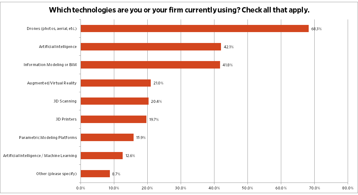 Over two-thirds of firms currently using drones in their project workflow. AI tools and Building Information Modeling (BIM) were each cited by around 40% of respondents.