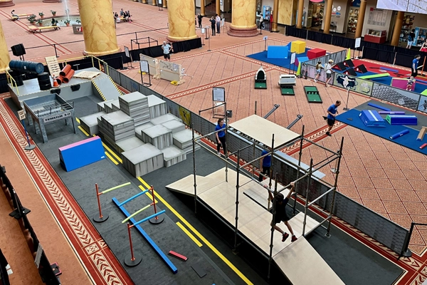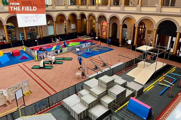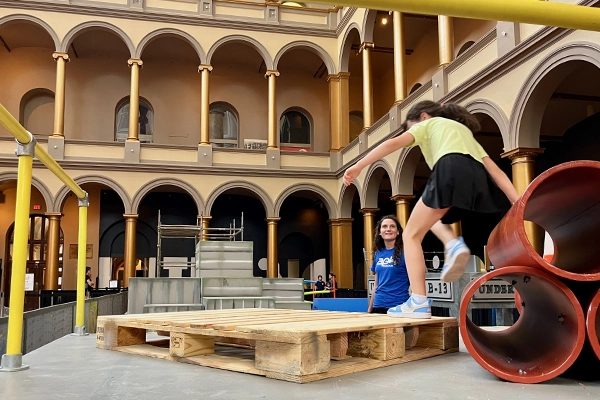 Through July 20, 2025, the West Court of the National Building Museum has been transformed into a parkour training course that draws inspiration from the work of landscape architect Lawrence Halprin, including Seattle's Freeway Park and Denver's Skyline Park. Halprin's designs often "emphasized interactive public spaces and dynamic, exploratory movement," making them ideal for parkour.