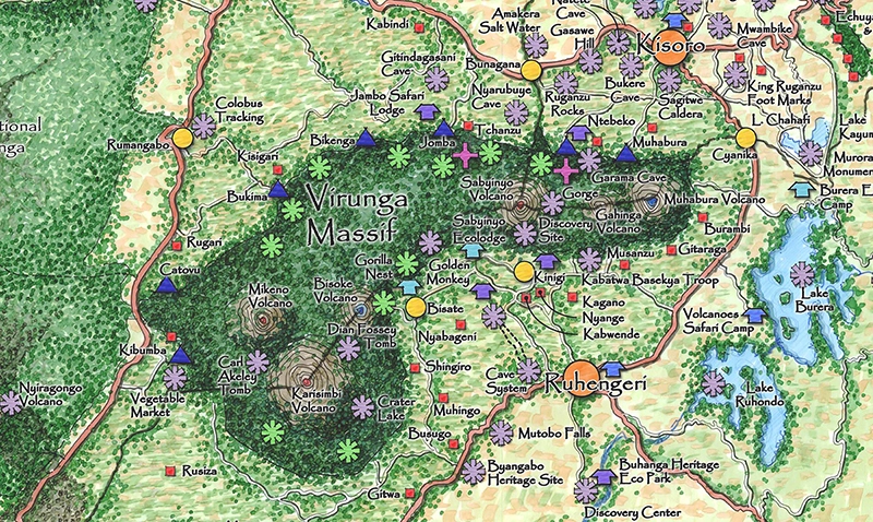 A heart-warming part of the master plan just got realized five months ago on the Uganda side of the Virunga Massif in Mgahinga National Park. The Batwa, indigenous peoples, who used to live in the forest but had been chased out when the National Park had been created in 1991, have now been re-located to a new village at the edge of the park and act as guides, taking visitors into the forest in the National Park, and showing them about their lives and connections with the forest. An eco-lodge where I had provided site planning consultancy funded the Batwa village and Visitor Center, so the Batwa community could share their culture and live closer to the forest instead of the nearby urban town of Kisoro.
