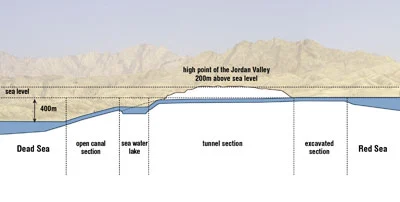 The proposed Red/Dead canal would carry water from the Red Sea to the Dead Sea. Salt water from the Red Sea could be transported initially in a pipeline over the adjacent topographic rise. At this point sea water could be carried in an open canal to the Dead Sea. Reaching the Dead Sea water would drop 1,500 ft drop in elevation. This drop could provide many synergistic values, generating hydro-electricity for use in powering homes and industries, or to desalinate sea water. New supplies of fresh water would open up new land in a previously uninhabitable area—the lower Jordan Valley. The World Bank is currently doing a feasibility study on this idea.