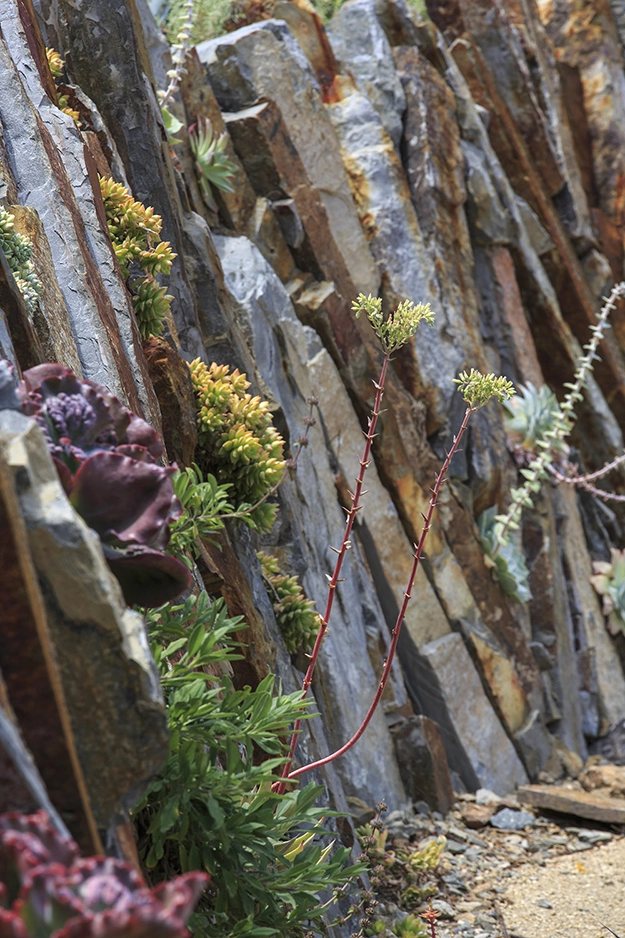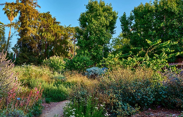 In the transition garden, silk floss trees attract birds and butterflies. The crevices of the living wall are planted with native dudleya plants and "create microhabitats for lizards and spiders," and rosemary and grape vines grow along the wall. "Pollinators and birds love it. And people keep stealing the dudleya." In the urban wilderness, native willows and oaks surround an "ephemeral stream," providing refuge for a range of species. "When I saw a hawk there, I knew we were successful."