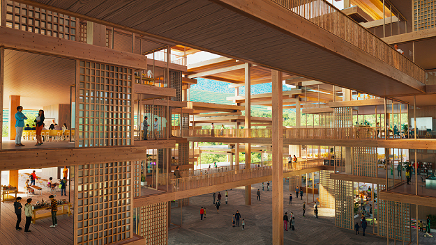 In addition, Bhutan is a carbon-positive country, absorbing more carbon than it emits. Its commitment to sustainability guided the planning of the new city, which will maintain a carbon-positive standard and use locally sourced, natural materials. Buildings will be approximately six stories high and made of stone, mass timber, and bamboo.