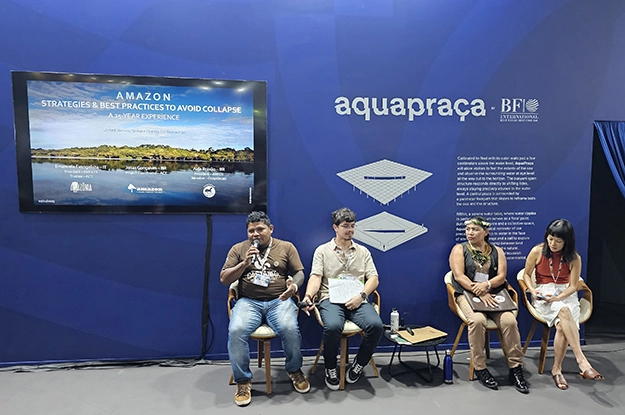 The Italian pavilion featured the event Amazon: Strategies and Best Practices to avoid Collapse – a 25-year Experience, with Alda Brazão, Indigenous leadership, showing how responsible tourism and science research can contribute to forest conservation when Indigenous peoples are respected and involved.
