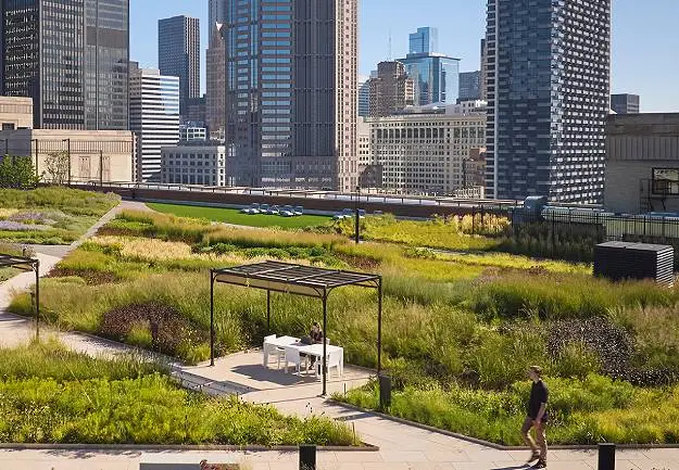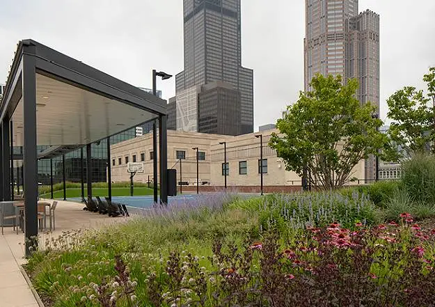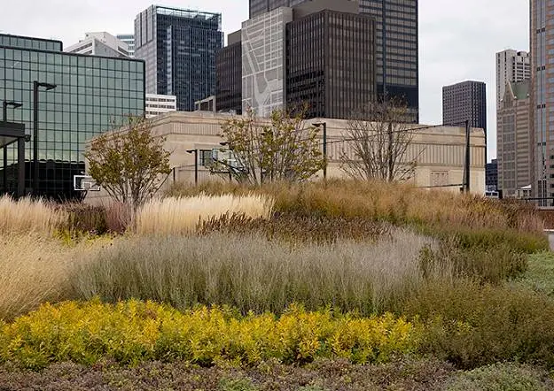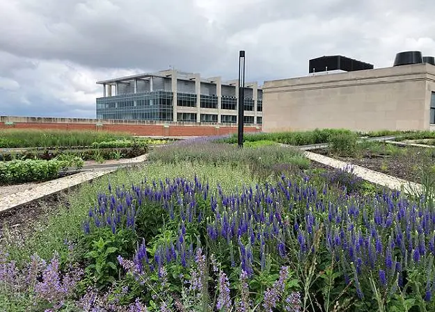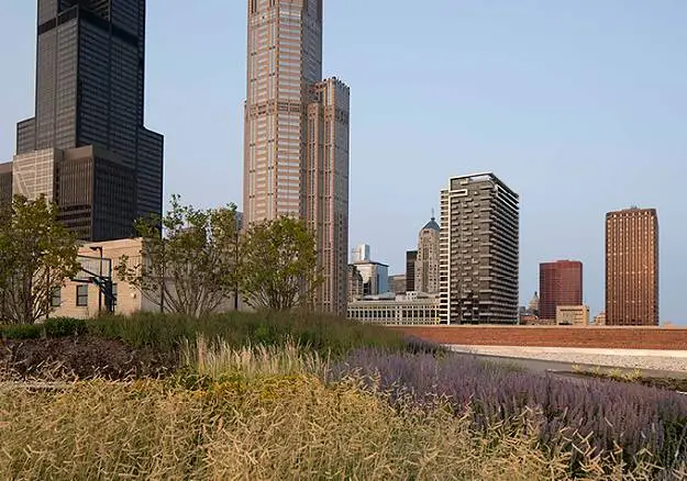 One example is the green roof on the historic Old Chicago Post Office building in Chicago, Illinois, which was designed by landscape architects at Hoerr Schaudt to provide seasonal blooms.