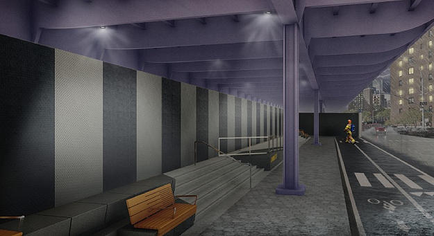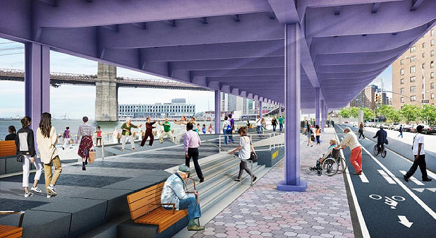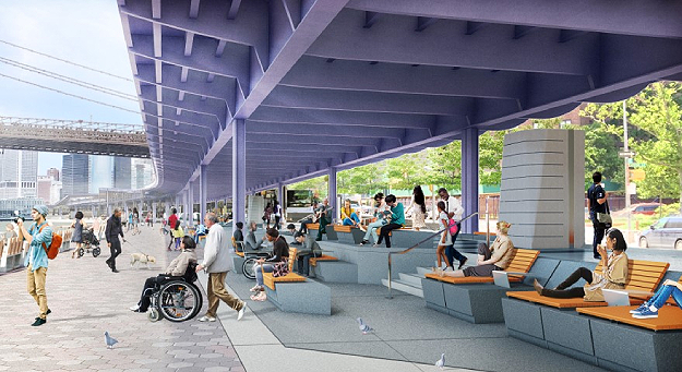 Under FDR Drive on the east side of Lower Manhattan near the Brooklyn Bridge, AECOM is adapting the design standards for the former East River Esplanade Masterplan designed by Ken Smith Workshop and Shopp Architects.