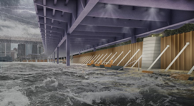 A series of retractable gates are being woven into the park along the East River. "They are like transformers; think of them as a mechanically operated landscape," Cruz said. "During major storm surges, they will operate and flip up."