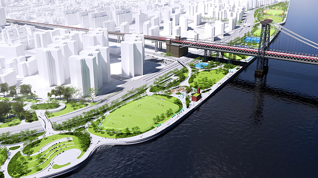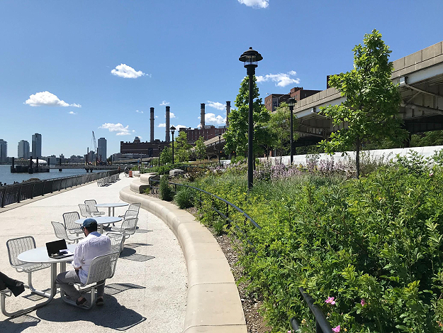 The new riverfront parks will be eight feet above the river and essentially built on top of the existing parks. "The new parks include flood protection elements, and portions of the East River Park are elevated to connect to new pedestrian bridges," said Molly Bourne, FASLA, a principal at MNLA.