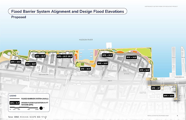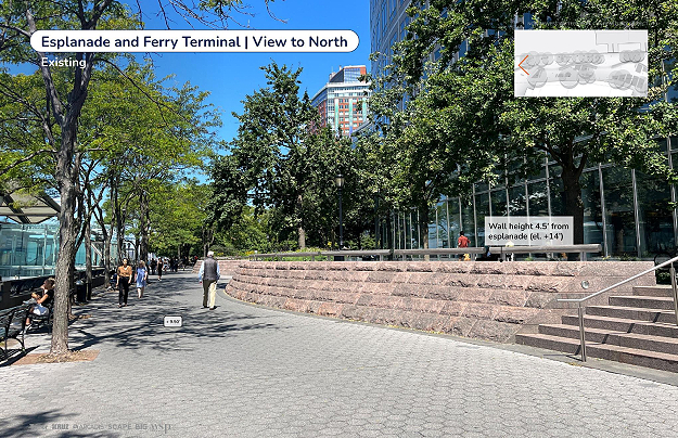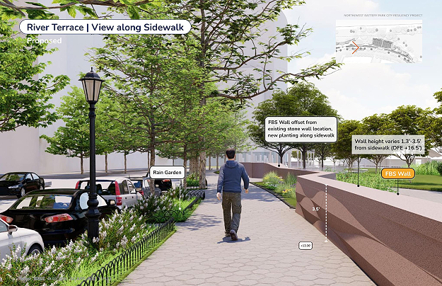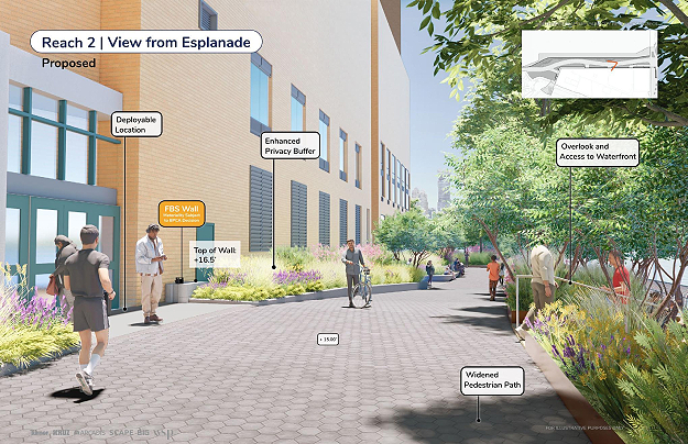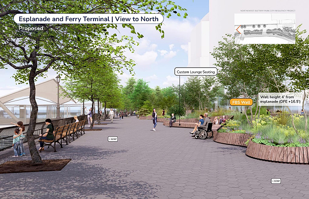 In Rockefeller Park, an artful flood wall is being stitched into a housing development. "The wall is a textural element. It can be concealed when it is high through material, color, and hue," said Rachel Claire Wilkins, Affil. ASLA, a senior landscape designer with BIG/CSM.
