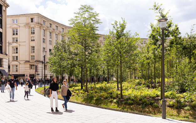 The transformation of Paris’ Place de Catalunya deserves recognition. Deprived of vegetation and composed primarily of paved surfaces, the place was not only hot, but also full of noise and air pollution. Today, it is home to 470 trees, which cover 60 percent of the site. There are over 5,000 square meters of permeable surfaces. More than half of rainwater is managed by swales. And the city estimates 4 degrees Celsius of cooling for its surroundings.