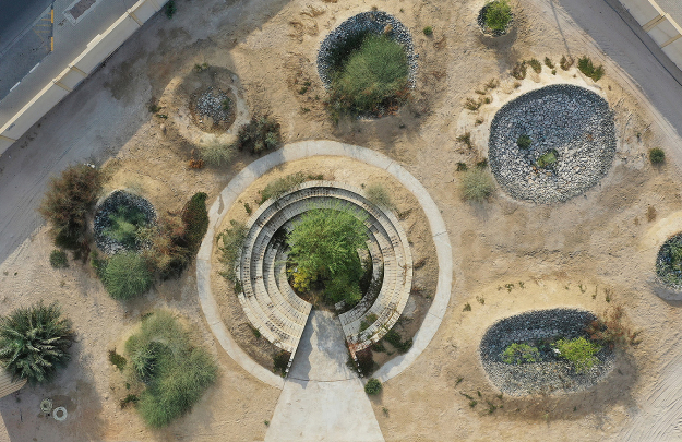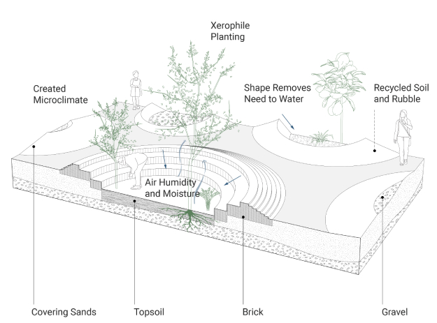A demonstration garden called Becoming Xerophile by Cooking Sections at the Sharjah Architecture Triennial in the United Arab Emirates shows how creating landforms can channel very small amounts of rainfall – enough to support drought-tolerant, arid tree species without extra irrigation.