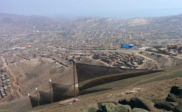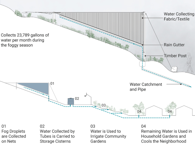 Another approach is to collect and use moisture in the air. In Peru, the Fog Water Farm Park and Gardens by Traction responds to water scarcity by taking advantage of the fog belt that is present six to nine months out of the year. Fog moisture is collected by simple fabric and timber structures and stored in cisterns to supply community gardens.
