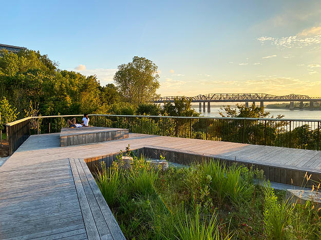 The park educates the public about Tom Lee, a Black man who saved 32 people from drowning on a sinking ship on the river. "The entire park's ethos is about having a generosity of spirit; its design is this grand welcoming gesture."