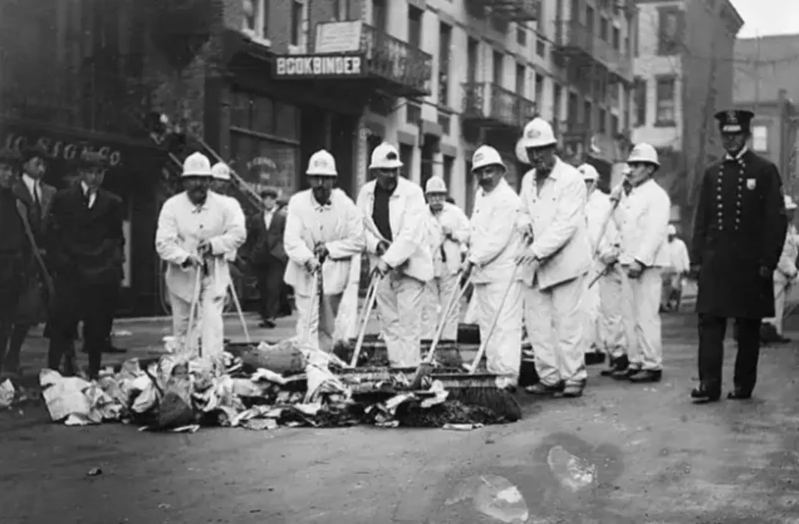 Waring would lead parades on horseback, with thousands of sanitation workers in army formation marching down the street. "It was a triumph of sanitation."