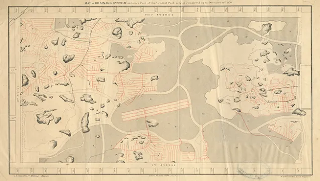 Considered the largest drainage project of his time, Waring designed a comprehensive system that directed water to constructed lakes and reservoirs. By 1859, the lower part of the park had been drained through a series of ceramic tubes buried deep into the soil that piped water directly to streams and ponds. "There was a mechanical movement to the low points," where water would flow to.
