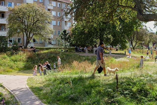 They accomplished this through an "interconnected series" of 18 bioswales that serve both a climate and social purpose. The swales steer water in the landscape and provide a framework for "playful, nature-rich, and safe meeting places for community and togetherness."