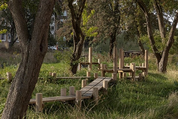 There are also cultural layers woven into the new design. In the original park, Sørensen framed views of Copenhagen’s Grundtvig’s Church. SLA preserved those views with its new trees and park design. Also incorporated are new functional wood artworks by Kerstin Bergendal, crafted with landscape studio Efterland. The artist worked with SLA to integrate the structures into the park, making exercise and play spaces mini-destinations.