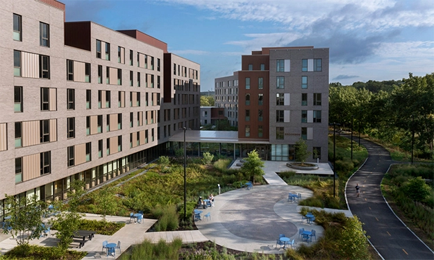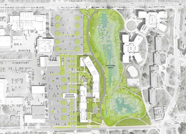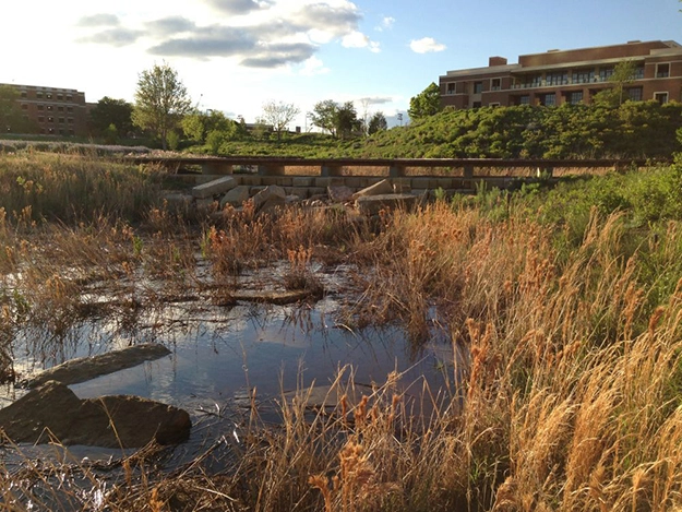 For a new campus building and landscape project at the University of Rhode Island, Sasaki found a stream impacted with invasive plants. To design a new landscape around a restored brook, they used a swamp area a few miles away as a reference ecosystem, planting the same species in the campus wetland.