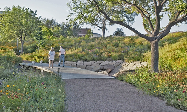 In these challenging urban conditions, modeling these landscapes meant creating a new water management system, including swales, irrigation systems, and cisterns. Mrs. Bush wanted a "big prairie bloom" every year, so the water system was key to supporting that.